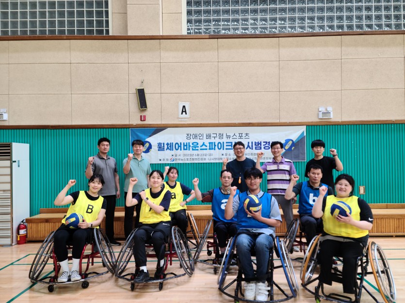 23년 6월23일 한국뉴스포츠발명진흥원 나사렛대학교 특수체육학과 주최로 충청남도 천안시장애인종합체육관에서 장애인 배구형 뉴스포츠 휠체어 바운스파이크볼 시범 경기를 진행하였습니다.