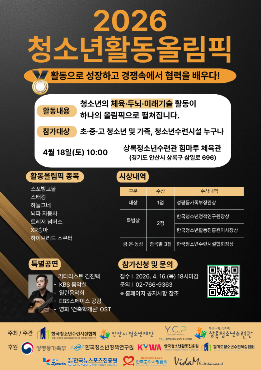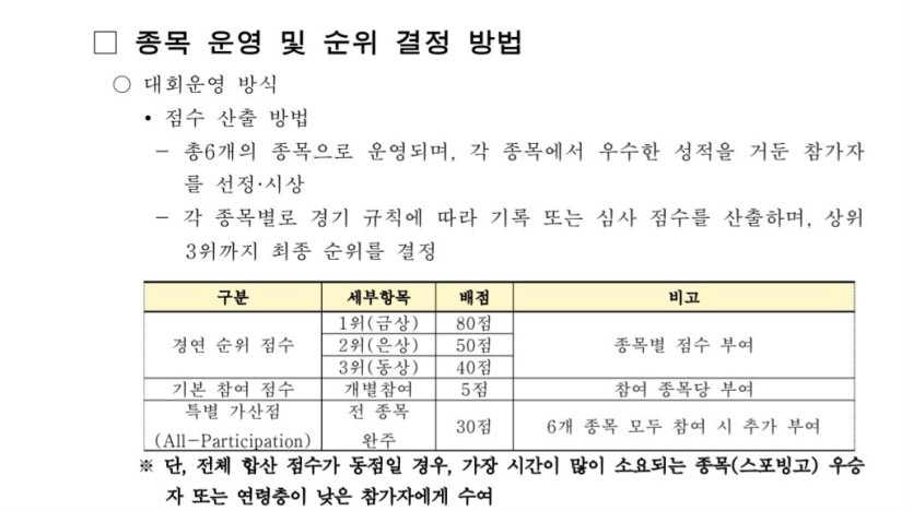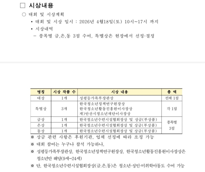 ※ 금·은·동상은 나이 제한 없이 모든 팀에게 주어지며, 성평등가족부 장관상은 반드시 청소년(9세~24세)에게 수여됩니다. 장관상 수상을 목표로 하는 팀 구성 시, 청소년을 꼭 1명 이상 포함해야 하며, 타 종목 참여까지 포함한 종합 점수로 결정된다는 점 참고 바랍니다❗